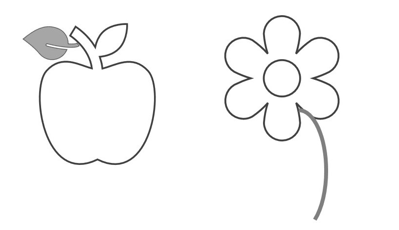 Дорисовать листочек яблоку. Дорисовать стебель цветочку.