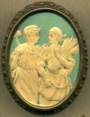 Quite different were the brooches (also earrings and rings) that were made in Palekh, Mstera, or Kholui. They were masterly executed miniatures close in style of painting to the Russian icons (ill. 149, 149a). Now you can find a large number of fakes of this jewelry. They differ from the original jewelry by much more rough painting and lack of the thinnest golden ornament. Moreover the genuine wares usually have the inscription «Палех», «Мстера» or «Холуй», the year of manufacture and sometimes the artist’s family name. Similar brooches were made also in Fedoskino, but with different subjects: pretty girls, landscapes etc (the girl in kokoshnic on ill. 149).