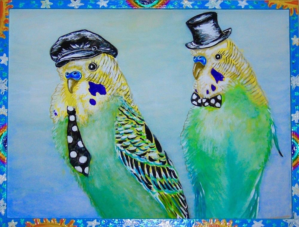 Поначалу, увидев незнакомца, оба попугайчика испугались, заметались по клетке, однако Ванюшка первым освоился в новом доме и моментально обежал все кормушки с зерном и попутно перепробовал все фрукты и листья салата. Гоша заинтересованно наблюдал, он был не на много старше Ванюшки, но по сравнению с ним казался уже вполне взрослой птицей из-за сдержанности и серьезности по отношению к младшему собрату и сразу же взял его под свою опеку.