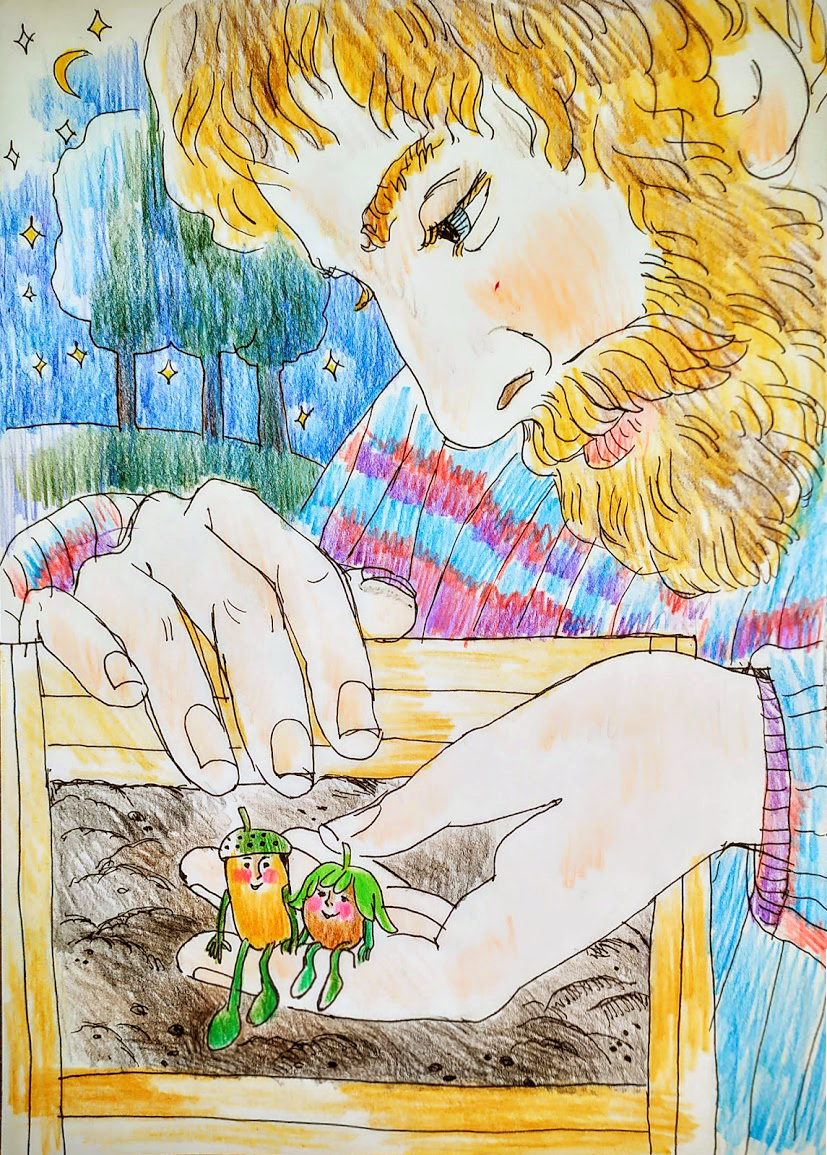 Желудь пожал листочку руку, а чувствительный орешек даже расплакался. Вдруг ветер сильно-пресильно подул, забрав красного путешественника с собой. Тем временем человек принес большой ящик с черной мягкой землей и аккуратно посадил туда орешек и желудь, приговаривая: