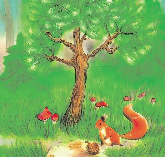 Из травы выскочил беличий хвост – и к сосне. Схватила белка шишку – и бежать, да не тут-то было, беличий хвост в расщелину попал и застрял. Она, бедняжка, его выдёргивать начала, да только ободрала и испачкала.