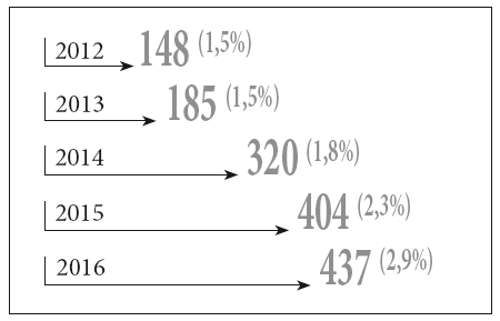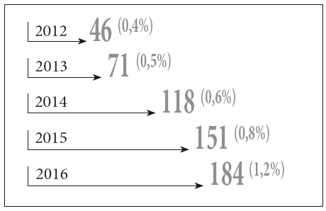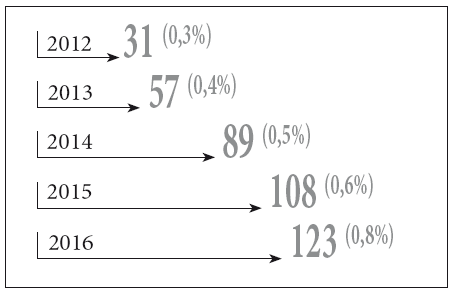 Рисунок 3. Термин «дигитализация» в заголовках и аннотациях статей, 2012–2016 гг.