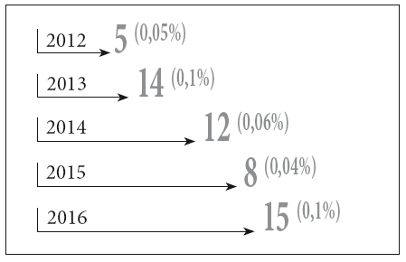 Рисунок 4. Термин «новые медиа» в заголовках и аннотациях статей, 2012–2016 гг.