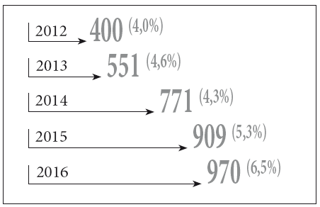 Рисунок 6. Термин «онлайн» в заголовках и аннотациях статей, 2012–2016 гг.