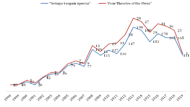 Школа исследований медиасистем начала складываться в середине 1950 гг. после публикации одной из самых известных работ в области медиаисследований – книги «Четыре теории прессы» Ф. Сиберта, У. Шрамма и Т. Питерсона (первое англоязычное издание вышло в 1956 г.) (Sibert, Shramm, Petersen, 1956). Несмотря на то что в последние годы интерес к работе уменьшается, можно утверждать, что ее влияние на развитие медиаисследований весьма значительно. Эта коллективная монография стала одной из самых публикуемых и переводимых книг в области изучения медиа и по-прежнему занимает одно из первых мест по количеству цитирований. С момента выхода в свет книга была переведена на множество языков, на русском она была издана в 1998 г., хотя достаточно подробное ее изложение можно было найти в коллективной монографии «Буржуазные теории журналистики. Критический анализ» (1980). Согласно данным Google Scholar, у этой книги на английском языке более четырех тысяч цитирований, на русском языке практически шестьсот (см. рис.).