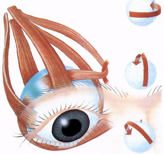 Первые относятся к гладким мышцам, они регулируют кривизну хрусталика (цилиарная или кольцевая или ресничная мышца) и изменение диаметра зрачка (сфинктер зрачка) – зрачковый рефлекс. Вторые – наружные относятся к поперечнополосатым, их шесть – это три пары глазодвигательных мышц, располагающихся в глазнице. Это четыре прямые (верхняя, нижняя, медиальная и латеральная) и две косые (верхняя и нижняя) мышцы. Прямые мышцы поворачивают глазное яблоко в соответствующем направлении, косые поворачивают глаз вокруг оптической оси.