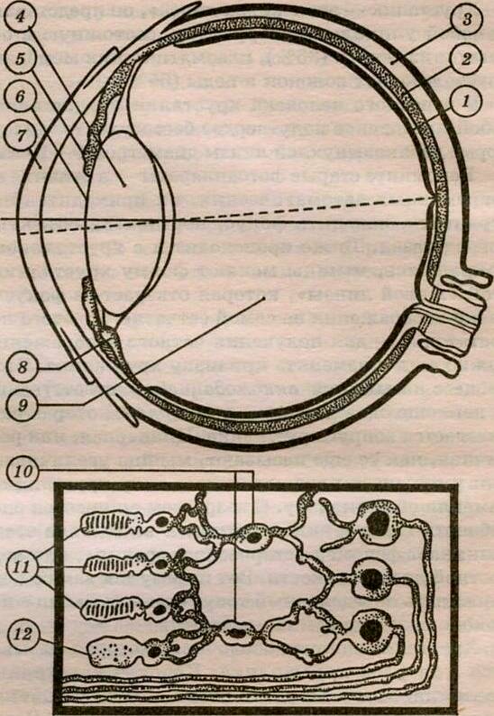 1. Внутренняя оболочка глазного яблока выстлана светочувствительным слоем, который называется – сетчаткой. Она состоит из двух различных типов светочувствительных нервных клеток, называемых по их форме палочками (11) и колбочками (12).