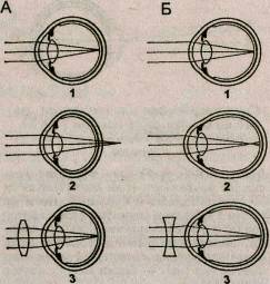 Глазу, как оптическому прибору, присущи различные несовершенства. Самое распространенное из них – аметропия: близорукость или дальнозоркость. Самая распространенная причина близорукости (Б) – глазное яблоко, которое слишком «длинно», поэтому лучи света образуют изображение перед сетчаткой.
