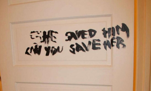Пока ожидали прибытия судмедэксперта, группа детективов, во главе со следователем отдела убийств Анджелой Суида, занималась изучением места происшествия. При осмотре непосредственно самого особняка детективы тут же столкнулись с ребусом, который в последующем «сломает» голову не одному эксперту. На внутренней стороны белой двери. Черной краской, была выведена фраза ««She saved him can you save her» что в переводе означает «Она спасла его а ты ее можешь спасти» – без знаков препинания и знака вопроса, хотя знатоки английского утверждают, что знак вопроса здесь, как бы, предполагается, потому что предложение изначально построено как вопросительное.