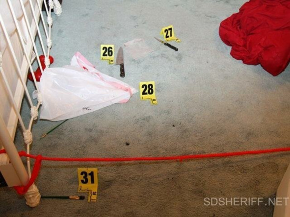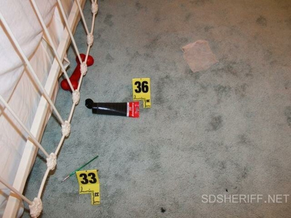 В спальне, откуда была повешена Ребекка, на полу были обнаружены 2 кисточки, тюбик черной акриловой краски (все это принадлежало Ребекке, поскольку она увлекалась рисованием), два ножа и моток красной синтетической веревки, на которой девушка и была повешена. Выглядело все следующим образом: одним концом веревка была привязана к ножке кровати скользящим узлом, а второй конец, в виде петли, был на шее девушки. Получается что Ребекка, разделась догола, намотала себе на голову толстовку, связала такой же веревкой ноги в районе щиколоток, руки – за спиной, надела петлю на шею, вышла на балкон и бросилась вниз (ну, может последовательность какая-то другая). Дело еще усложнялось тем, что на месте происшествия не было никаких следов пребывания посторонних лиц – все отпечатки и следы принадлежали лишь Ребекке и Джоне. На рукояти ножа шеф повара, найденного в спальне, так же нет отпечатков пальцев – совсем никаких, что может давать предположение что их намеренно стерли, однако на лезвии есть четкие отпечатки пальцев самой Ребекки.