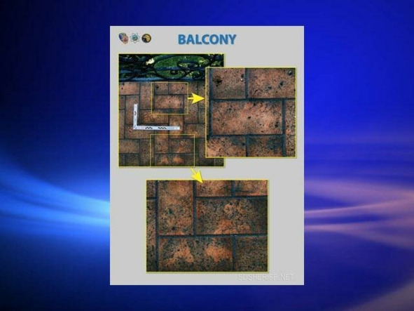 Еще большой интерес представляют полы на балконе. Видимо, балкон открывался не часто (спальня – то гостевая) и прислуга его тоже частой уборкой не баловала, поэтому он изрядно запылился и отлично оставил следы… Следы там только от босых ног Ребекки, таким образом, никто посторонний на балкон не выходил и, по крайней мере, в момент повешения, согласно следам, никого там кроме девушки не было.
