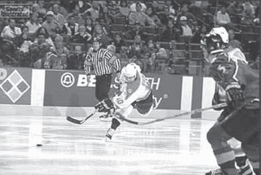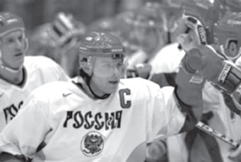 «…До конца́ ма́тча де́сять мину́т. Вперёд выхо́дит но́мер 10 – Па́вел Буре́. Он обхо́дит одного́ проти́вника, друго́го. Де́лает переда́чу. Тепе́рь ша́йба у но́мера 7. “Ша́йбу! Ша́йбу!” – крича́т боле́льщики…