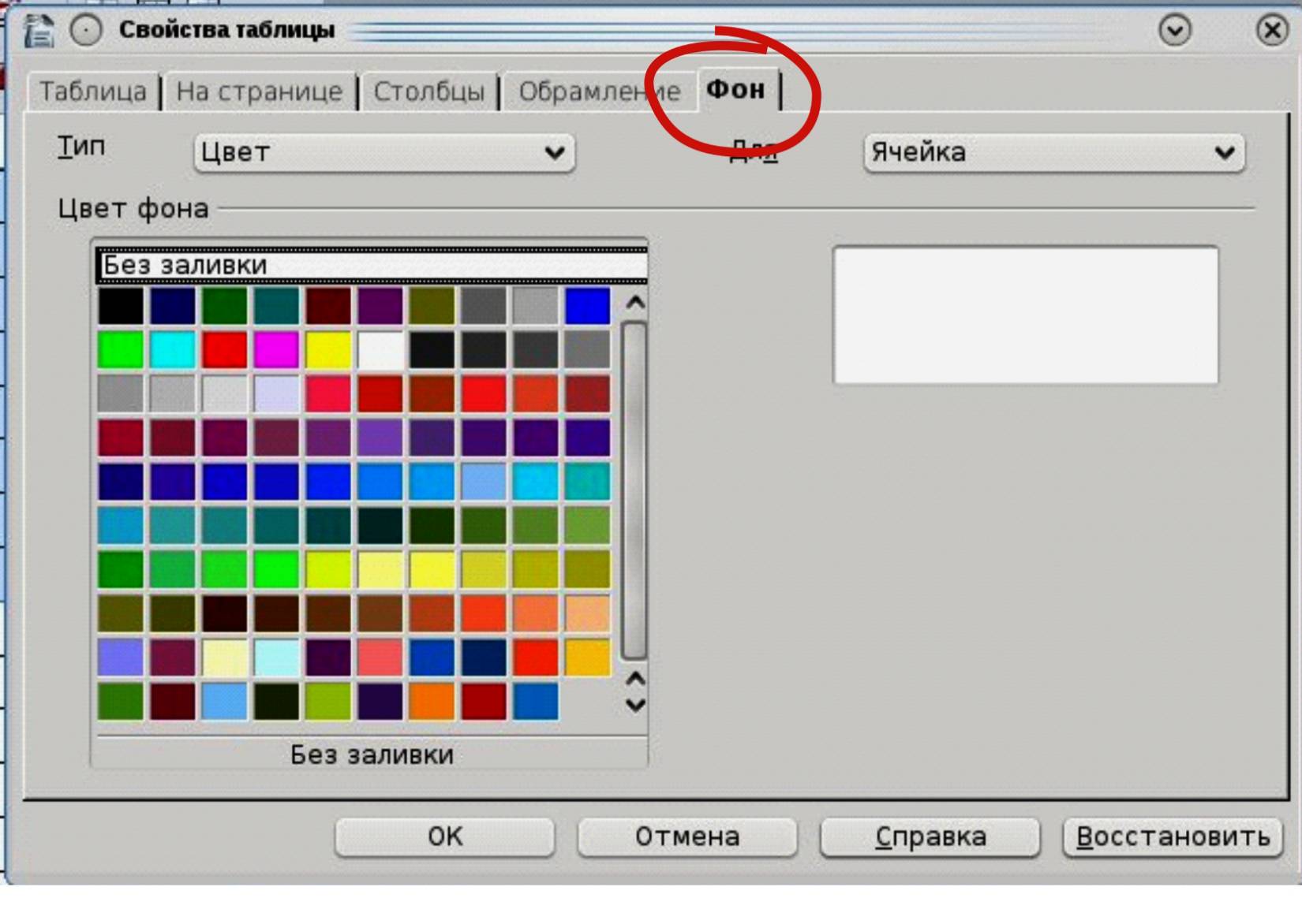1. Выделить ячейки и открыть окно Свойства таблицы. Открыть вкладку Фон.