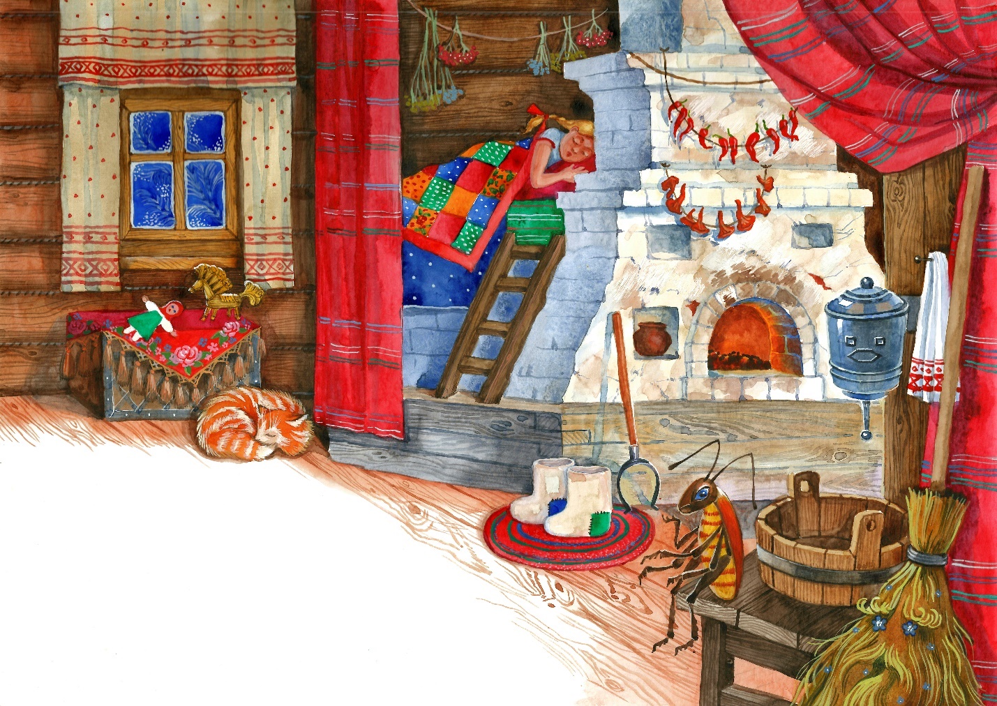 Сверчок-немолчок тотчас из щели выглянул: «Никак хворать вздумала, сердешная?» Бабка Анисья захлопотала, порушку собрала: сухой малины с липовым медом кипяточком залила, настояла и пить Танюшке дала. Потом малую на печь отправила да строго наказала: пятки в шерстяных носках прижимать к горячим кирпичам, сколь терпенья будет. Тогда хворь как рукой сымет.