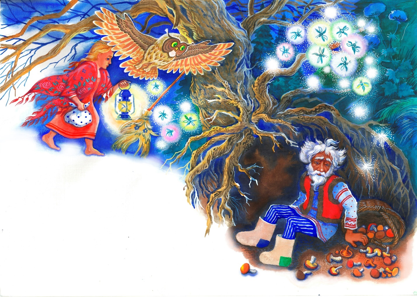 Так и отправились: впереди Сова, пёстра голова, жёлтыми глазищами дозор ведет, круги охватывает, вслед ей – светлякова неисчислимая рать по кустам вспыхивает. Да так светло сделалось, что грибы в траве видно. А деда пока не найдут.