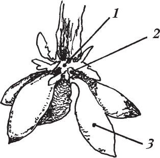 Рисунок 5. Корнеклубень георгина: 1 – корневая шейка, 2 – ростовые почки, 3 – клубень