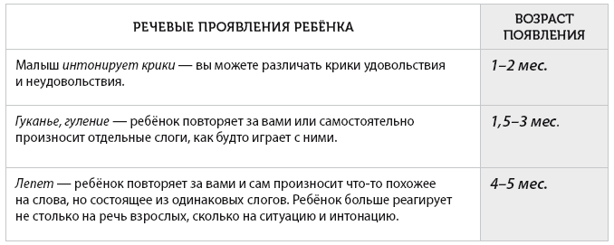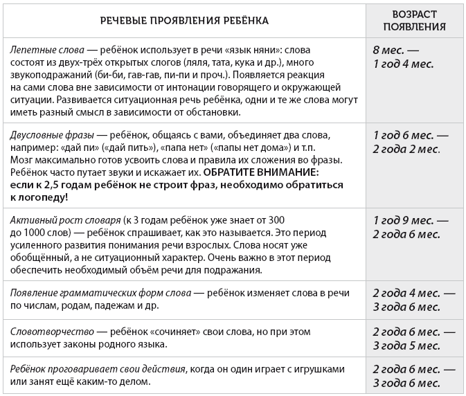 Эта таблица заимствована из внешнего источника и приводится здесь не для жёсткой оценки ребёнка и уровня его развития, а лишь чтобы дать возможность приблизительно ориентироваться в сроках и последовательности развития форм речи, что может быть особенно полезно для молодых родителей и начинающих педагогов. В реальной жизненной ситуации эти параметры могут значительно варьировать в зависимости от социальной и психологической ситуации развития ребёнка, его индивидуальных особенностей, пола и других факторов. Тем не менее, если даже при благоприятных условиях развития в определённые возрастные периоды указанные формы речи у ребёнка не появляются, это должно насторожить близких.
