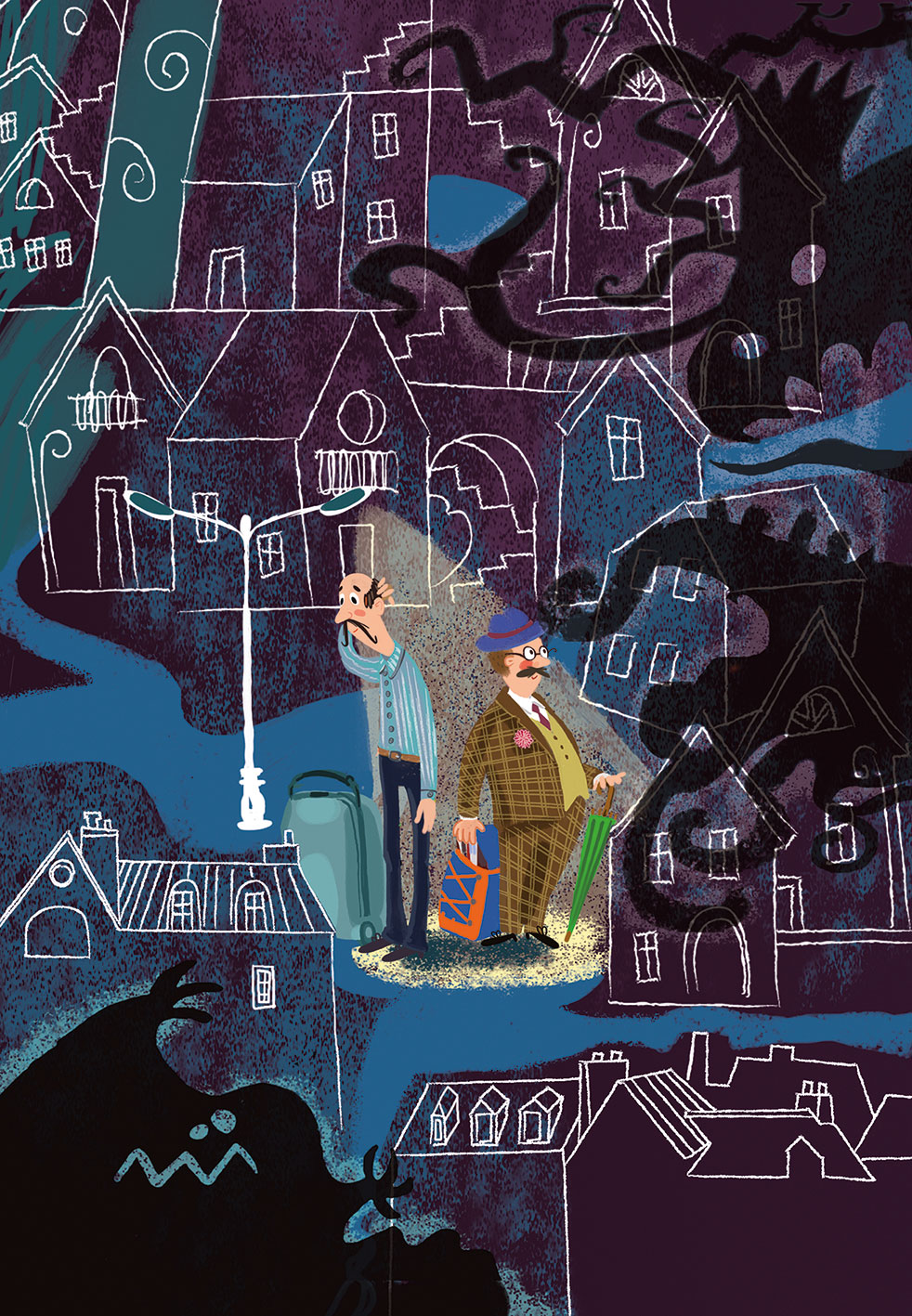 Великанов взвалил на спину рюкзак, Крошкин подхватил два чемодана (свой и кота), сунул под мышку зелёный зонт-трость, и друзья поспешили вперёд по широкой городской улице, надеясь встретить кого-нибудь из местных жителей и узнать у него, где находится улица Переплётная.