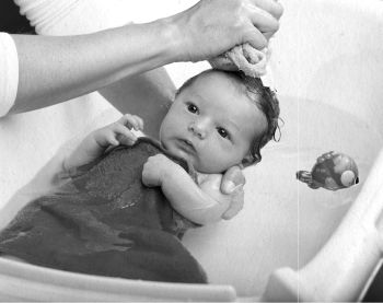 Мыло (не туалетное, а специальное детское, с минимальным количеством добавок) или детскую пенку рекомендуется использовать не чаще 1–2 раза в неделю, причем не добавлять их в воду, а наносить на кожу и смывать душем. Мыльная вода сушит слизистую влагалища. Есть мнение, что до того момента, как ребенок начал ползать по полу (т. е. до момента, когда он действительно может испачкаться), или до момента, когда малыш начал есть прикорм (т. е. размазывать по лицу руками кашку или пюре) – нет смысла мыть его с мылом, ведь ребенок еще ничем не пачкается, находится постоянно либо на руках у родителей, либо в чистой кроватке. И лишний раз беспокоить его кожу мыльными средствами не только бессмысленно, но и вредно – смывается защитный слой кожи. Но, во-первых, при этом все равно необходимы ежедневные купания в чистой воде, а во-вторых, это не исключает подмывания ребенка с мылом после того, как он покакал. Можно добавлять в ванну различные травяные отвары. Однако необходимо учитывать, что почти все из них подсушивают и без того сухую кожу младенцев. В конце зимы и весной в городах в воду центрального водоснабжения добавляется увеличенное количество хлорки, что сильно сушит кожу малышей при ежедневном купании. В этом случае рекомендуется добавлять в воду при купании специальные смягчители, например календуловое средство для купания. А после купания – смазывать кожу малыша детским маслом.