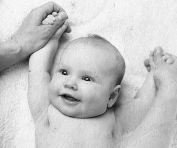 – И. п. – то же. Нужно вложить свои указательные пальцы ребенку в ладошки. Он при этом должен хорошо ухватиться за них, прочно их удерживать, а затем совершить попытку приподнять голову и плечи.