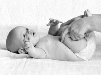 – И. п. – лежа на спине. Мама должна левой рукой обхватить голени малыша, а правой держать левое предплечье. Таким образом мы как бы помогаем крохе слегка повернуться на бок. На ту сторону, куда будет разворот, можно поместить яркий предмет, чтобы привлечь внимание малыша. Делайте повороты попеременно направо и налево.