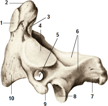 1 – задний бугорок; 2 – борозда позвоночной артерии; 3 – отверстие поперечного отростка; 4 – ямка зуба; 5 – передняя дуга; 6 – передний бугорок; 7 – поперечный отросток; 8 – верхняя суставная ямка; 9 – задняя дуга; 10 – позвоночное отверстие