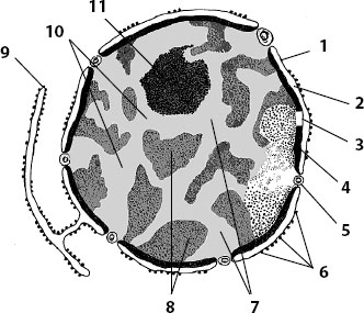 1 – наружная мембрана кариотеки (наружная ядерная мембрана); 2 – перинуклеарное пространство; 3 – внутренняя мембрана кариотеки (внутренняя ядерная мембрана); 4 – ядерная пластинка; 5 – поровый комплекс; 6 – рибосомы; 7 – нуклеоплазма; 8 – гетерохроматин; 9 – цистерна зернистой эндоплазматической сети; 10 – эухроматин; 11 – ядрышко