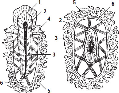 Рис. 37. Зубочелюстное соединение («вколачивание»), слева – продольный, справа – поперечный распил: