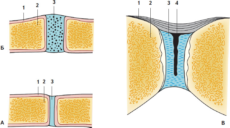 А – синдесмоз: 1 – надкостница; 2 – кость; 3 – волокнистая соединительная ткань; Б – синхондроз: 1 – надкостница; 2 – кость; 3 – хрящ; В – симфиз (гемиартроз): 1 – надкостница; 2 – кость; 3 – межлобковый диск; 4 – щель в межлобковом диске