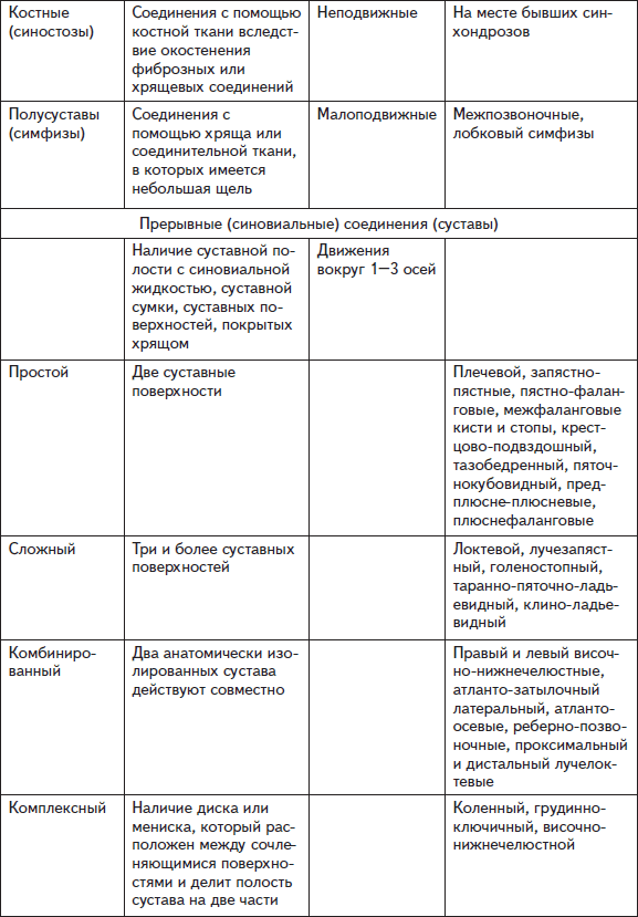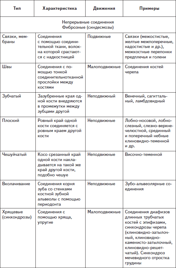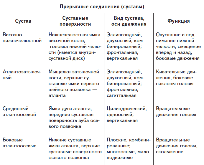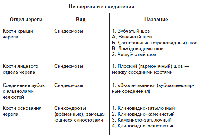 Таблица 7. Соединения костей черепа и черепа с позвоночником