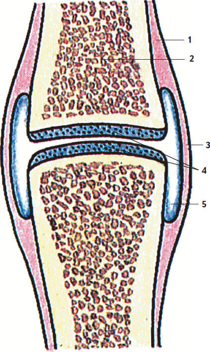 1 – надкостница; 2 – кость; 3 – суставная капсула; 4 – суставной хрящ; 5 – суставная полость
