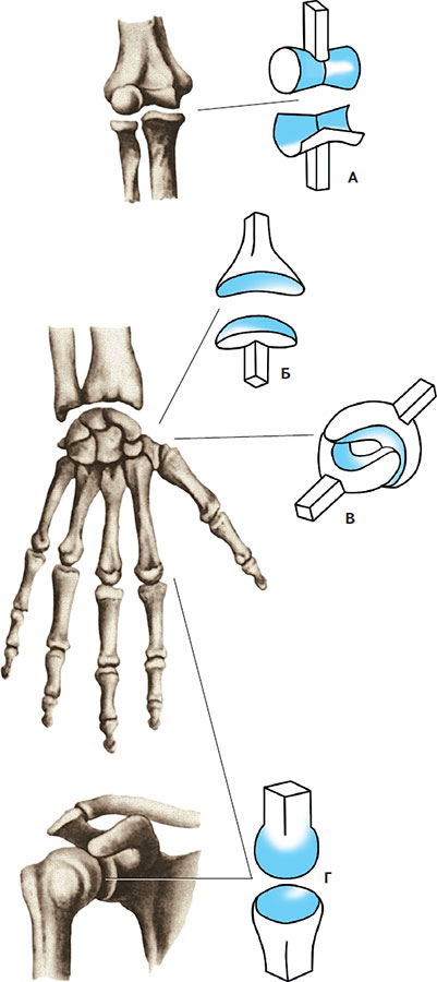 Рис. 40. Схематическое изображение суставных поверхностей суставов различной формы: