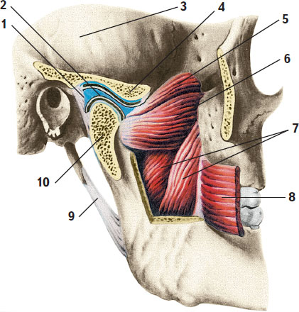 1 – суставная капсула; 2 – суставный диск; 3 – чешуйчатая часть височной кости; 4 – суставный бугорок; 5 – верхняя головка латеральной крыловидной мышцы; 6 – нижняя головка латеральной крыловидной мышцы; 7 – медиальная крыловидная мышца; 8 – щечная мышца; 9 – шилонижнечелюстная связка; 10 – головка нижней челюсти