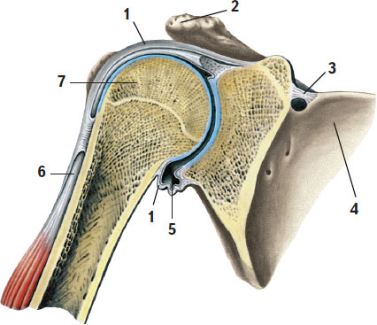 1 – суставная капсула; 2 – акромион; 3 – верхняя поперечная связка лопатки; 4 – лопатка; 5 – суставная полость; 6 – сухожилие двуглавой мышцы плеча (длинная головка); 7 – головка плечевой кости
