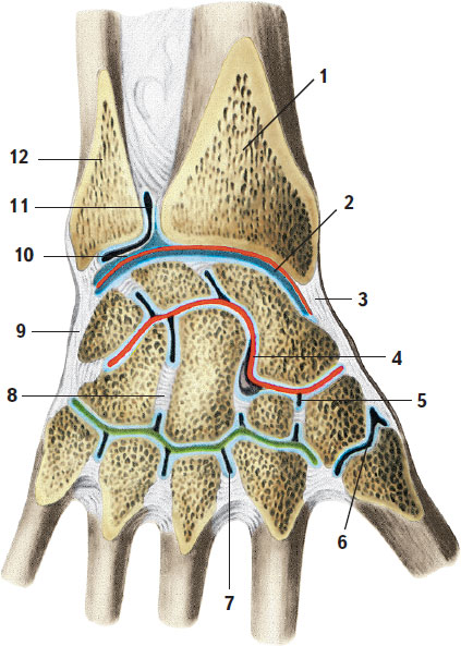 1 – лучевая кость; 2 – лучезапястный сустав; 3 – лучевая коллатеральная связка запястья; 4 – среднезапястный сустав; 5 – межзапястный сустав; 6 – запястно-пястный сустав; 7 – межпястный сустав; 8 – межзапястная связка; 9 – коллатеральная локтевая связка запястья; 10 – суставный диск; 11 – дистальный лучелоктевой сустав; 12 – локтевая кость