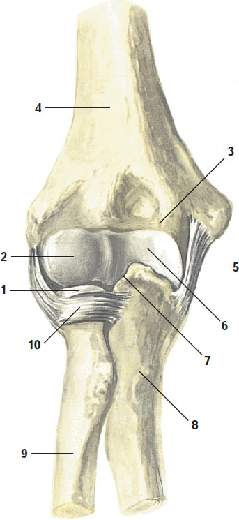 1 – головка лучевой кости; 2 – головка плечевой кости; 3 – суставная капсула; 4 – плечевая кость; 5 – локтевая коллатеральная связка; 6 – блок плечевой кости; 7 – суставная полость; 8 – локтевая кость; 9 – лучевая кость; 10 – кольцевая связка лучевой кости