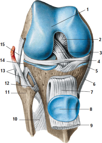 1 – надколенниковая поверхность; 2 – задняя крестовидная связка; 3 – передняя крестовидная связка; 4 – поперечная связка колена; 5 – медиальный мениск; 6 – коллатеральная большеберцовая связка; 7 – надколенниковая связка; 8 – суставная поверхность надколенника; 9 – сухожилие четырехглавой мышцы бедра; 10 – межкостная перепонка голени; 11 – головка малоберцовой кости; 12 – передняя связка головки малоберцовой кости; 13 – сухожилие двуглавой мышцы бедра; 14 – латеральный мениск; 15 – коллатеральная малоберцовая связка
