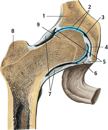1 – тазовая кость; 2 – суставный хрящ; 3 – полость сустава; 4 – связка головки бедренной кости; 5 – вертлужная губа; 6 – поперечная связка вертлужной впадины; 7 – связка – круговая зона; 8 – большой вертел; 9 – головка бедренной кости