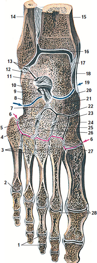 1 – суставы третьего пальца (полость); 2 – плюснефаланговый сустав (полость); 3 – межкостные плюсневые связки; 4 – кубовидная кость; 5 – межкостная клино-кубовидная связка; 6 – предплюсне-плюсневый сустав; 7 – тыльная кубовидно-ладьевидная связка; 8 – пяточно-кубовидный сустав; 9 – пяточно-кубовидная связка; 10 – пяточно-ладьевидная связка (9 + 10 – раздвоенная связка); 11 – межкостная таранно-пяточная связка; 12 – подтаранный сустав (полость); 13 – задняя таранно-малоберцовая связка; 14 – малоберцовая кость; 15 – большеберцовая кость; 16 – голеностопный сустав (полость); 17 – большеберцово-таранная часть; 18 – большеберцово-ладьевидная часть (17 + 18 – медиальная коллатеральная (дельтовидная) связка); 19 – поперечный сустав предплюсны; 20 – таранно-ладьевидный сустав (полость); 21 – ладьевидная кость; 22 – клиноладьевидный сустав (полость); 23 – межкостная межклиновидная связка; 24 – медиальная клиновидная кость; 25 – промежуточная клиновидная кость; 26 – латеральная клиновидная кость; 27 – межкостная клино-плюсневая связка; 28 – коллатеральные связки