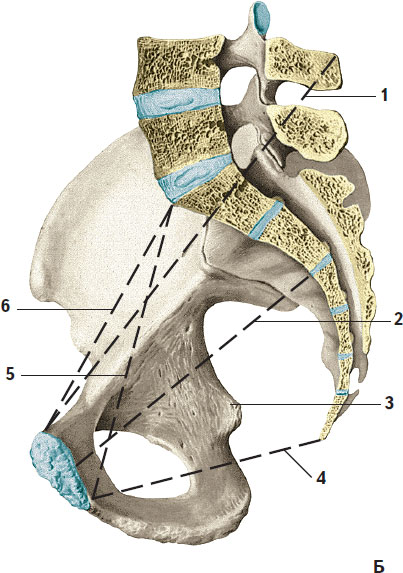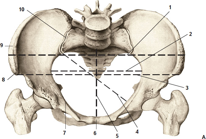 А – вид сверху: 1 – расстояние между гребнями подвздошных костей (дист. «cristarum»); 2 – поперечный размер входа в малый таз; 3 – расстояние между передними верхними остями; 4 – косой размер входа в малый таз; 5 – прямой размер (истинная конъюгата); 6 – лобковый симфиз; 7 – подвздошно-лобковое возвышение; 8 – верхняя передняя подвздошная ость; 9 – крыло подвздошной кости; 10 – крестцово-подвздошное сочленение; Б – сагиттальный распил, вид изнутри (со стороны полости таза): 1 – наружная конъюгата; 2 – прямой размер (полости таза); 3 – ось таза; 4 – прямой размер (выхода из полости таза); 5 – диагональная конъюгата; 6 – истинная (гинекологическая) конъюгата