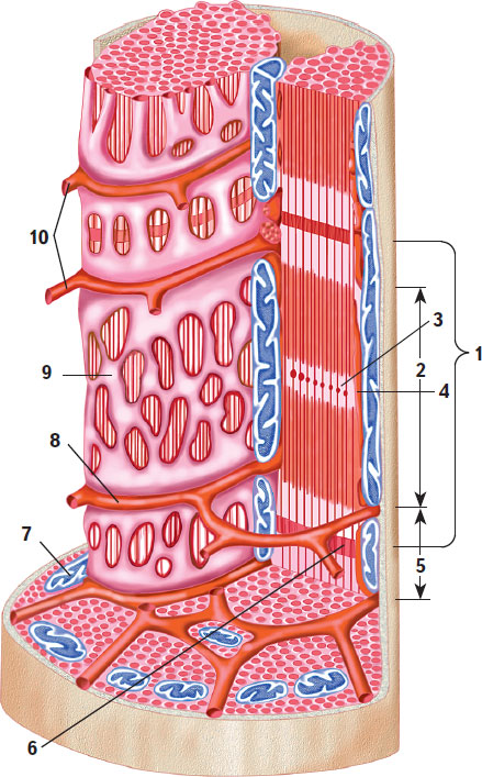 1 – саркомер; 2 – полоска А (диск А); 3 – полоска H; 4 – линия М (мезофрагма) в середине диска А; 5 – полоска I (диск I); 6 – линия (телофрагма) в середине диска I; 7 – митохондрия; 8 – конечная цистерна; 9 – саркоплазматический ретикулум; 10 – поперечные трубочки
