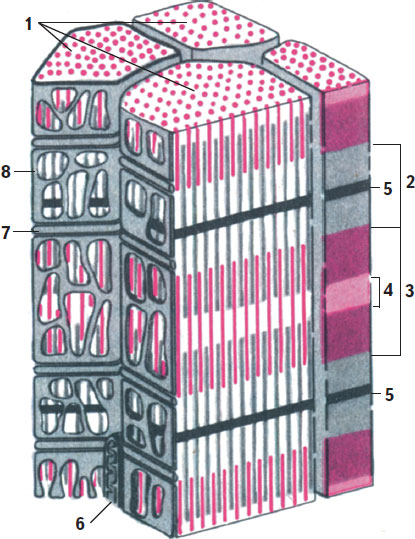 1 – миофибрилла; 2 – диск I; 3 – диск А; 4 – полоска Н; 5 – Z-линия; 6 – митохондрия; 7 – Т-трубочка; 8 – саркоплазматический ретикулум