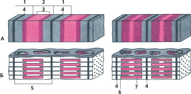 А: слева – расслабленная, справа – сокращенная; Б: миозиновые и актиновые филаменты слева в расслабленном и справа в сократившемся саркомере; 1 – диск I; 2 – диск А; 3 – полоска Н; 4 – Z-линия; 5 – саркомер; 6 – актин; 7 – миозин