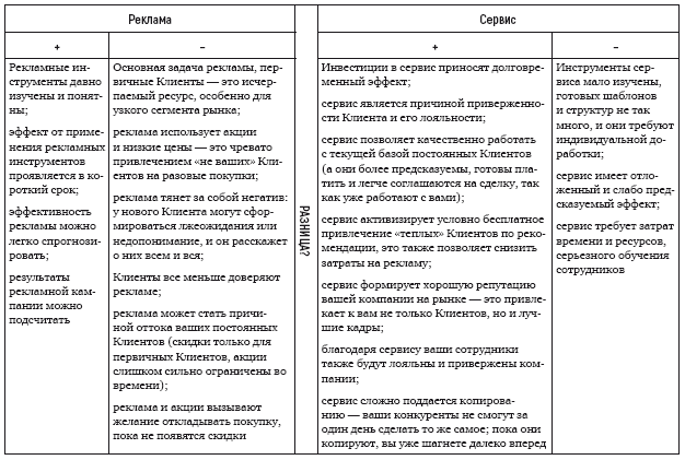 Вывод: без сервиса рекламные усилия менее эффективны. Можете сколько угодно печатать листовки, составлять крутые медиапланы с выходами в прайм на федеральных каналах. Если в точке продаж Клиента встречают грязный пол, неудобные стулья и продукт без гарантии, то шансов на хорошие продажи мало. При этом для роста и развития вашей компании необходимо привлечение новых Клиентов с помощью рекламы, поэтому от нее не стоит отказываться совсем. Все хорошо в комплексе. И должно подкрепляться PR и продажами.