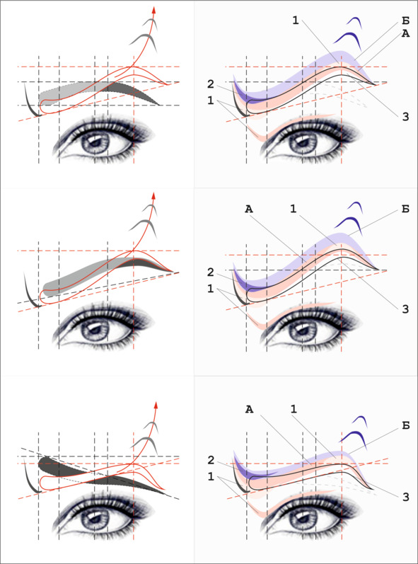 1 /2— акценты, 3 – измененная «новая» форма брови.