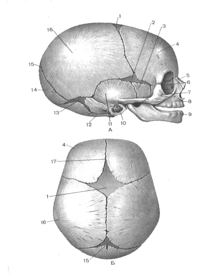 Рис. 1. Череп новорожденного. Вид сбоку (А) и сверху (В): 1 – передний родничок, 2 – клиновидный родничок, 3 – большое крыло клиновидной кости, 4 – лобный бугор, 5 – носовая кость, 6 – слезная кость, 7 – скуловая кость 8 – верхняя челюсть, 9 – нижняя челюсть, 10 – барабанное кольцо височной кости, 11 – чешуя височной кости, 12 – латеральная часть затылочной кости, 13 – сосцевидный родничок, 14 – затылочная чешуя, 15 – задний родничок, 16 – теменной бугор, 17-лобный шов.