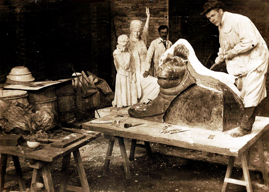 На заводе Виллера был отлит в бронзе сам монумент, четыре тематических барельефа пьедестала, цепи и четыре декоративных фонаря. (В семейном альбоме дедушки сохранилась фотография, как он извлекает из гипсовой формы базу фонаря, составленную из трех смотрящих в разные стороны львов.)