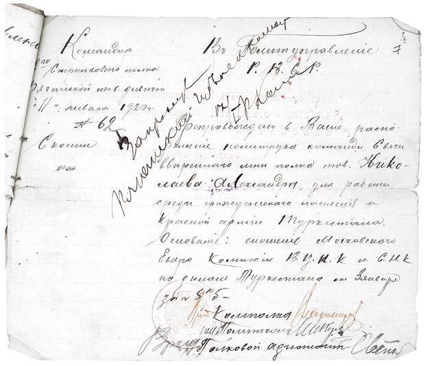Сообщение о направлении А.В. Николаева в распоряжение Политуправления РВСР для работы среди гражданского населения и Красной армии Туркестана. 11 января 1920 г.