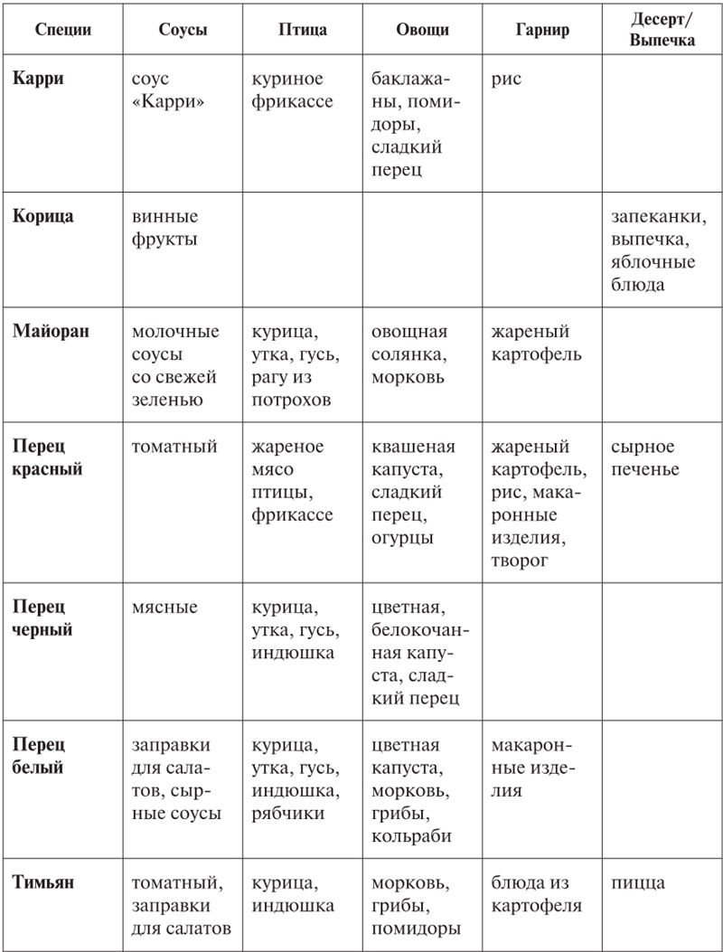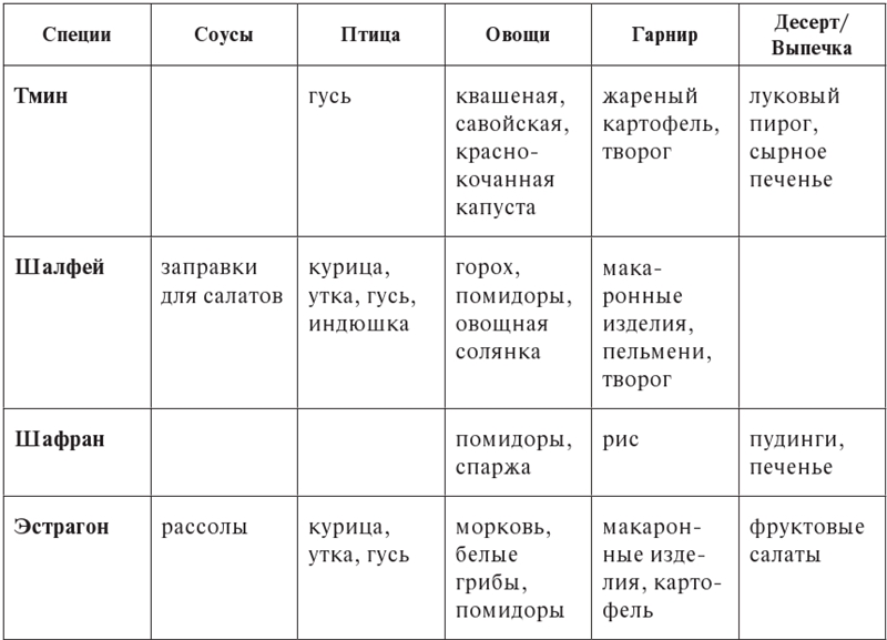 В следующей главе, которая называется «Полезные кулинарные таблицы», ты познакомишься с очень важной для хорошей хозяйки информацией и узнаешь, какие конкретно специи и пряности нужно использовать в приготовлении различных блюд.