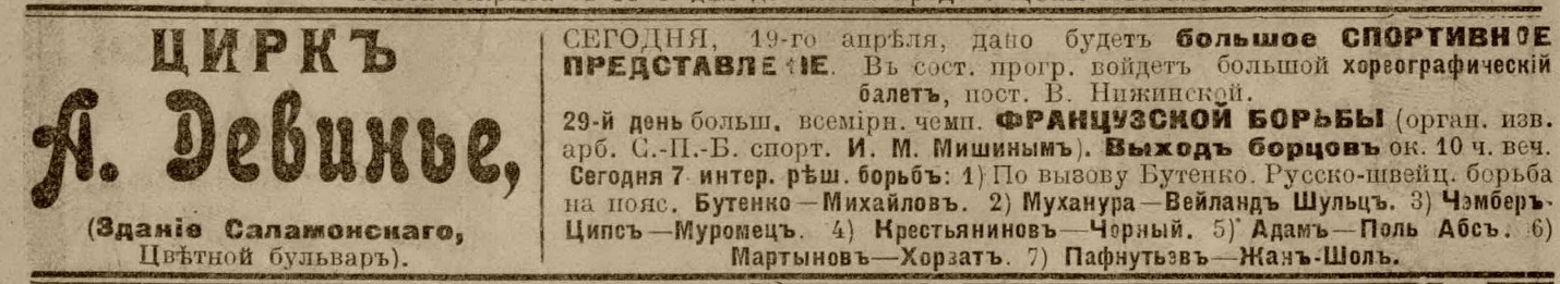 «ТЕАТР» № 1269 от 19 апреля 1913 года. Цирк А. Девинье. Цветной бульвар. Большое спортивное представление. В состав программы войдёт большой хореографический балет, постановка В. Нижинской.